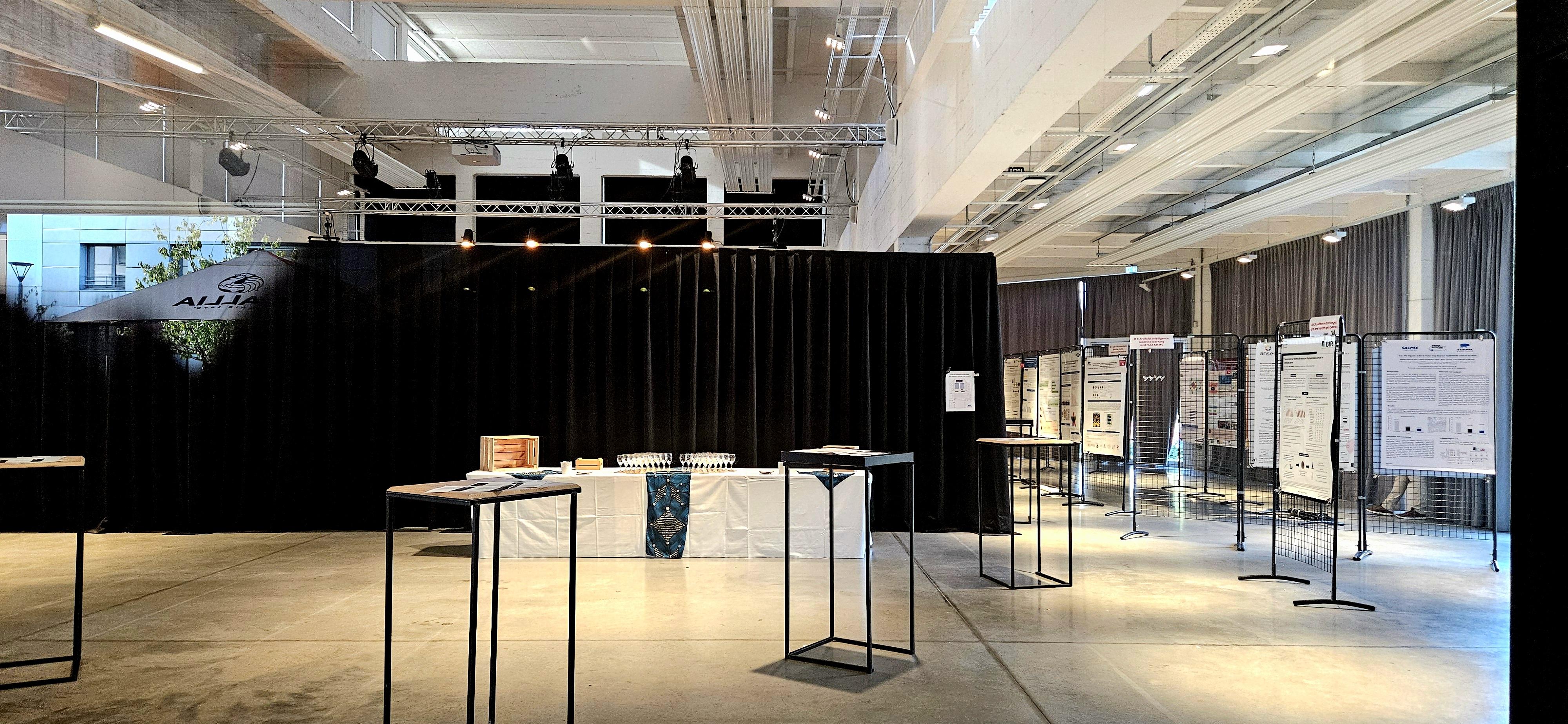 Un grand rideau noir masque la partie de la salle dans laquelle sont sont promulguées les paroles et discours.