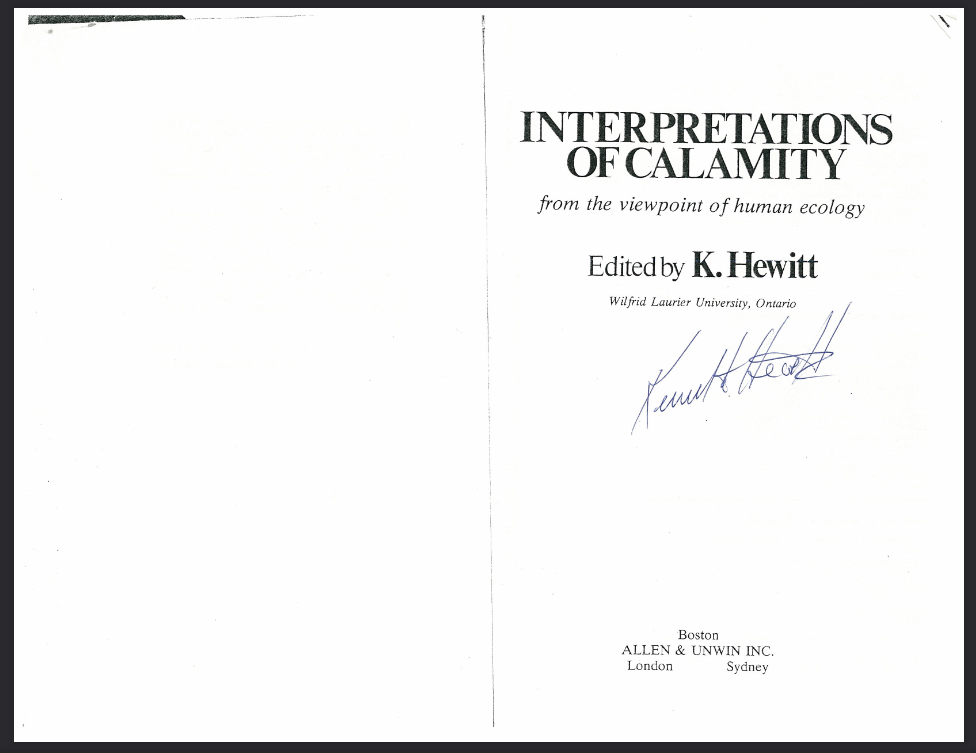 « On attribue généralement à Kenneth Hewitt (1983) la première critique, dans le champ des études sur les catastrophes, de la construction de l’édifice technocratique sur la base d’idéaux types ou de conceptions « mythiques » de la société. », S. Revet, Le sens du désastre. Les multiples interprétations d’une catastrophe “naturelle” au Venezuela, 2010